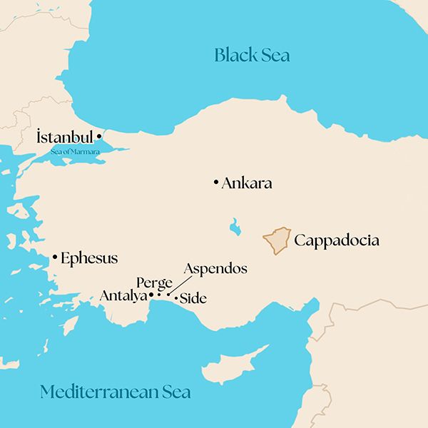 A day visiting the renowned ancient cities that lay east of Antalya. The ruins of ancient Perge are among the most impressive on the Mediterranean, and also the home of fine statues displayed in the Antalya Archaeological Museum. After touring the site, you will continue on to Aspendos to see one of the best-preserved theater buildings of the ancient world.